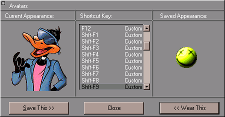 You do this through the Avatars window. To display this window, select Members from the Avatars menu, or Save/Wear avatars from your avatar pop-up menu. This window lets you store up to 22 avatars and instantly recall them, either by clicking in the listbox provided, or by using a corresponding hotkey combination (either Control-0 through Control-9 or F1 through F12). The Avatar window is divided into three parts, as shown in the following window. The scrolling list in the center of the window contains a slot for each Shortcut Key (these function as hotkey combinations for ultra-speedy changes). In addition, the list indicates which avatar slots are currently in use and which are available.