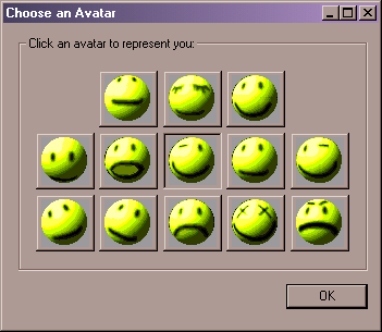 The Palace lets you completely replace your roundhead with a new image for your avatar. You import your new avatar image as a graphic file, which you then save as a prop. Depending on how big this avatar prop is, you either save it in your prop window and wear it like any other prop, or save it as a grouped collection of props in your Choose an Avatar window (see Changing expression and color). > An avatar is really just a collection of props, including at least one head prop (a prop that replaces the default roundhead image). This head prop serves as a "centerpiece" for the rest of the avatar. A prop measures 44 by 44 pixels; an avatar can contain up to 9 props (132 by 132 pixels). You can create your own avatars by importing bitmap graphic files that meet these size criteria. There are two ways to create your avatar, depending upon the size of the original image you've selected.