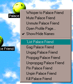 NOTE: In your Palace client, you might see different menu items for member versus guest features. Ignore these; if you have registered, you are a member. Also, the terms wizard and god are now referred to as operator and owner, respectively.