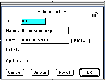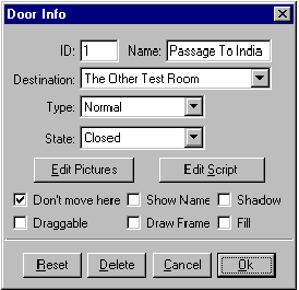 If the current selection is a Passage, you will probably want it to have a destination. You can select the destination of a Passage by choosing one of your existing rooms from the dropdown (or right-arrow popup on the Macintosh) list.The Macintosh version also lets you choose the destination room by entering its ID number. If your current selection is a Bolt, you'll want to set its destination to equal the ID number of the Lockable Door it toggles.- Edit Pictures (Windows version)