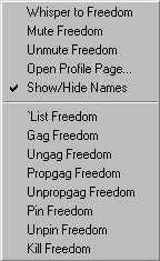 If you are using the Palace User Software client for Windows 95/98/NT, you have special options when bringing up somebody's avatar pop-up menu (right-click on their avatar for this menu). You access the following menu: