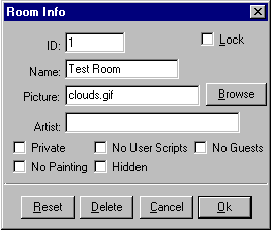 This menu command causes the server to create a new room and add it to the script on the server (this may take a minute on slower systems). The new room will receive a RoomID number one higher than the highest previous RoomID used. Its default name will be New room roomID and its default background will be "Clouds.GIF." Your avatar will appear in the room.