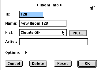 In the illustration above you'll see a line called Pict which will read "Clouds.GIF" without the quotation marks. Just change the name there to the name of the image you want to call up--we'll call that "Filename.GIF" Type the name of the GIF in that spot, making sure you put the appendix .GIF and you should immediately see your new picture as the background to the room.