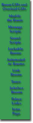 ON SELECT { "!This message script will appear on the screen with the spiky balloon!" LOCALMSG } The only difference between this script and the first one is the insertion of the exclamation mark directly after the first quotation mark. The exclamation mark causes the message to appear in a spiky balloon. You could further vary it by causing the message to appear in the "thought" balloon format by replacing the exclamation mark with a colon. Try it. Your script should look something like this: ON SELECT { ":This message script will appear in a thought balloon." LOCALMSG } ![]() So far so good and if you haven't crashed yet, you should congratulate yourself. But you have noticed that the balloon always comes from the upper left corner, and sometimes you will want to vary the location of where the balloon appears. You can do that by putting coordinates into the script. Let's do that with the following script: ON SELECT { "@100 100This message will make the message balloon appear at coordinates 100 across, 100 down!" LOCALMSG } Note that directly AFTER the first quotation mark I've put an @ symbol followed by two coordinates. The coordinates are separated only by a space. You can vary the coordinates of the message, then. Try changing the 100 100 to 200 200. Then to 300 300. Your message balloon will appear in different spots each time, which is really handy. To see one possible use of such coordinate messages, go to CyberQuest, then to the Quest for Romance section, then to the Ballroom. If you click on the chandelier there you'll see some pop up avs of Fred Astair and Ginger Rogers. Accompanying them, you'll see message scripts activating, messages that describe the room and the various things in it. The message scripts, however, seem to come from Fred and Ginger rather than from the upper left corner of the room. It's a cool effect.